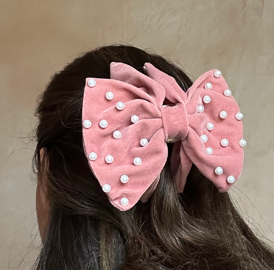 'Eva' Velvet Pink Bow Claw Clip with Pearls
